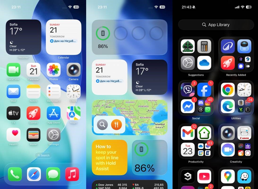 بعيدًا عن شاشة القفل، لا تزال واجهة iOS تعتمد على شاشات رئيسية ممتلئة بالتطبيقات والويدجت. لديك مكتبة التطبيقات للتطبيقات الأقل أهمية، إضافة إلى مركز الإشعارات ومركز التحكم. هناك أيضًا صفحة Spotlight للبحث.