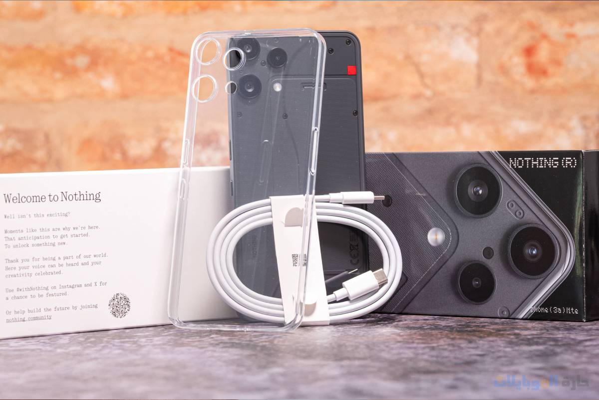 يصل الهاتف داخل العلبة الشهيرة بتصميم Nothing المميز، والتي تأتي بتشطيبات الورق اللامع والكثير من التفاصيل المطبوعة، مع رسالة خاصة داخل العلبة الداخلية. وتحتوي مكونات التجزئة داخل العلبة على الهاتف نفسه، وكابل USB، ودبوس إخراج شريحة SIM بتصميم فريد، كما يأتي مرفقًا داخل العلبة غطاء حماية Silicon بسيط لكنه عملي.