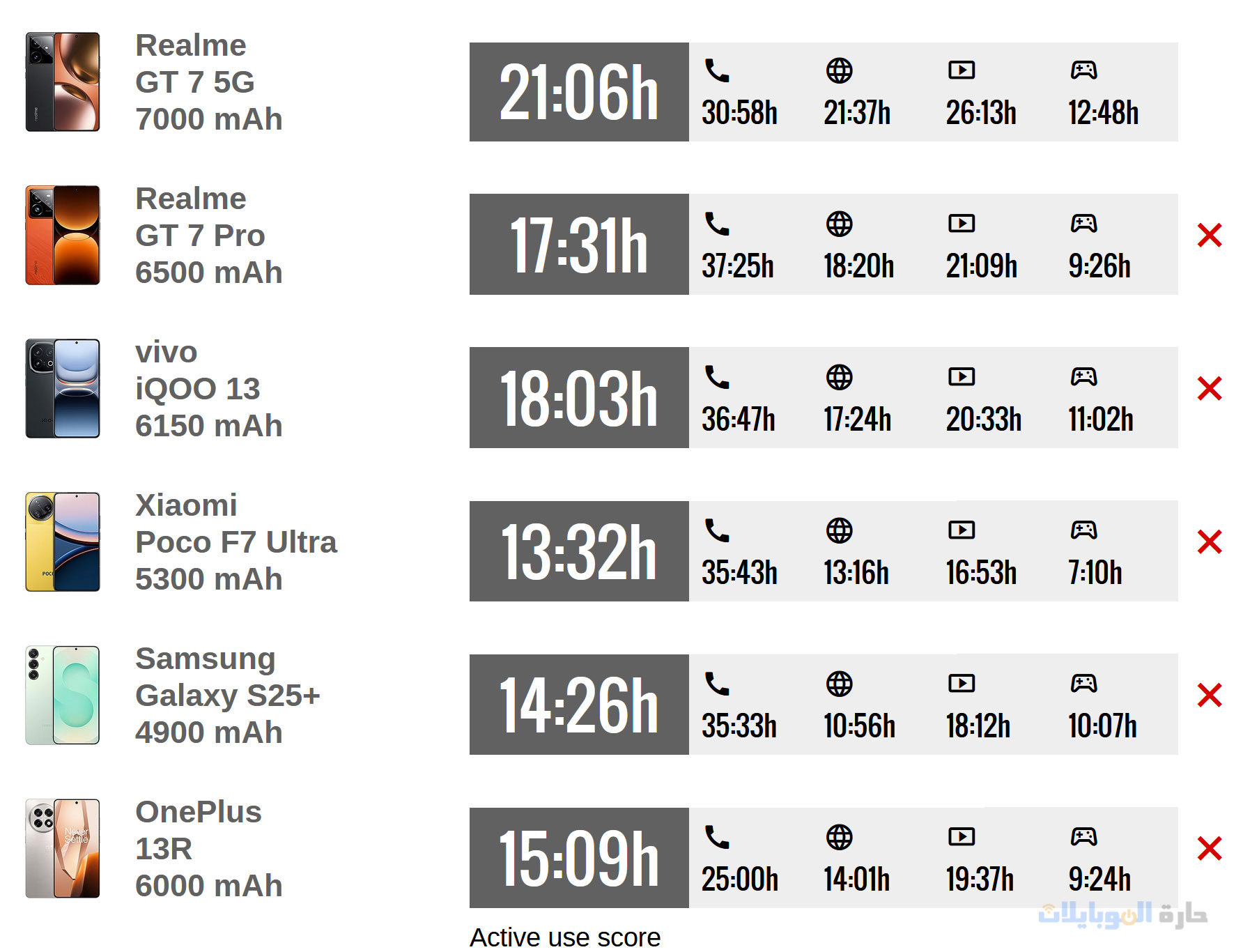 ويلي هاتف Realme GT 7 هاتف Apple iPhone 16 Plus و بعده iQOO 13 بمعدل استخدام نشط يبلغ 18:49 و18:03 ساعة على التوالي. أما هاتف Realme GT 7 Pro العالمي، المزود ببطارية بسعة 6,500 مللي أمبير/ساعة (الطراز الهندي مزود ببطارية بسعة 5,800 مللي أمبير/ساعة)، فيحتل المركز الخامس في القائمة بمعدل استخدام نشط يبلغ 17:31 ساعة. يمكنك الاطلاع علي القائمة كاملة بالاسفل.