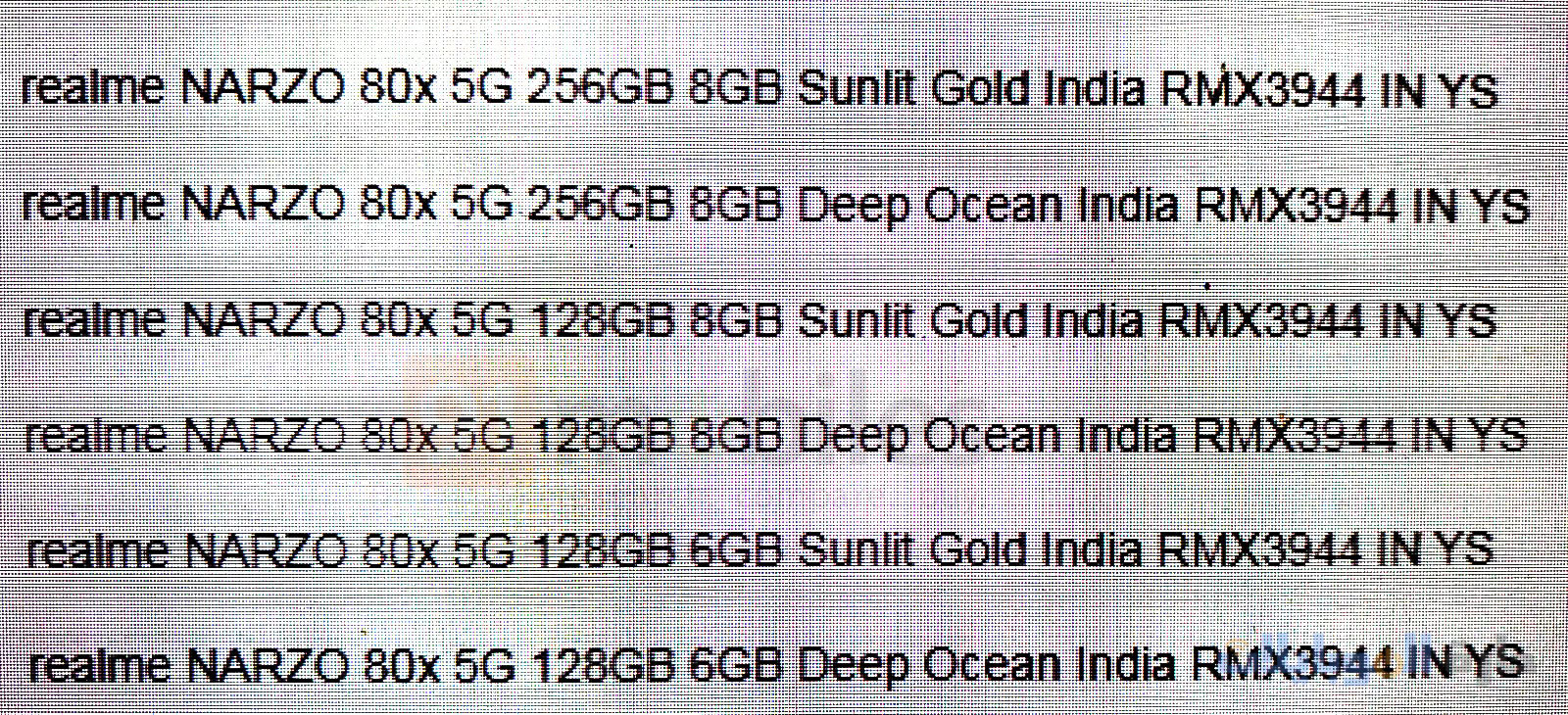 يدعي المصدر أن هاتف Realme Narzo 80x سيتم تقديمه بألوان Deep Ocean و Sunlit Gold مع ثلاثة خيارات للذاكرة – 6GB / 128GB و 8GB / 128GB و 8GB / 256GB.