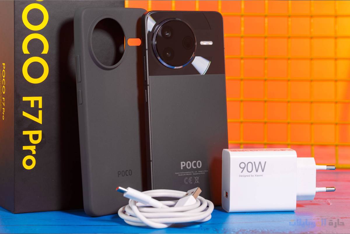 يصل Poco F7 Pro داخل عبوة كرتونية باللونين الأسود والأصفر، وهو التصميم المميز الذي اعتادت عليه هواتف العلامة التجارية. وقد تختلف محتويات العلبة من سوق إلى آخر، إذ إن محول الطاقة بقدرة 90 واط الذي حصلنا عليه قد لا يكون موجودًا في النسخ المخصصة لأسواق الاتحاد الأوروبي.