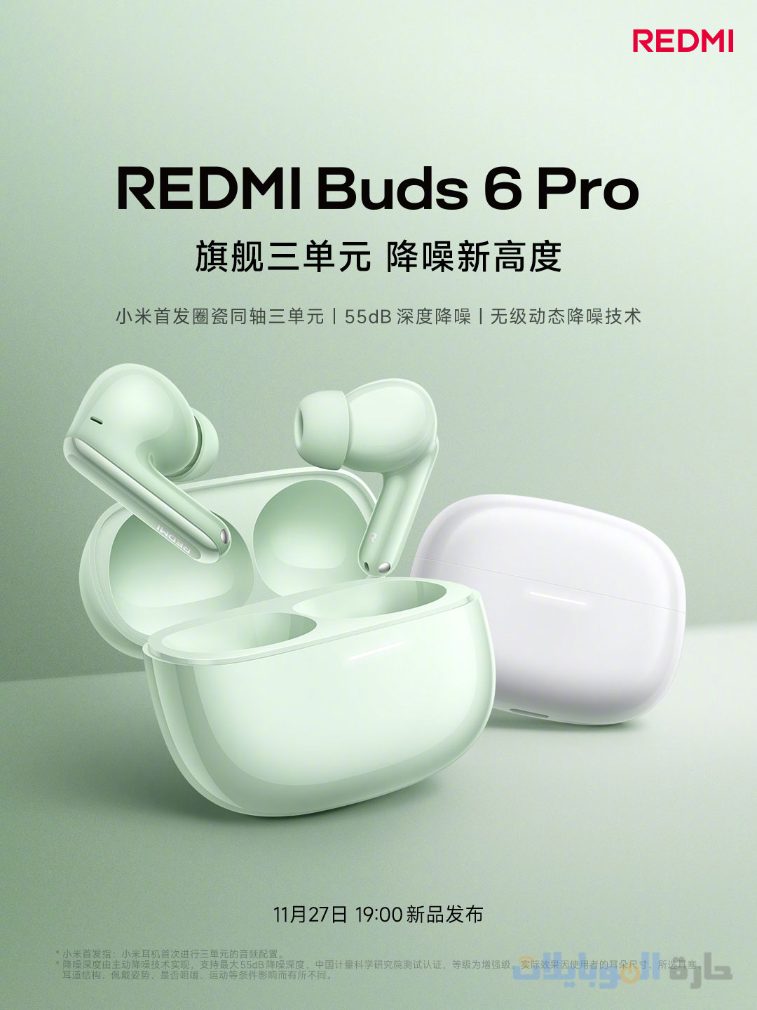 ستكون سماعات Redmi Buds 6 Pro أول سماعات TWS في سلسلة Redmi تقدم محركات سيراميك متحدة المحور. تقوم العلامة التجارية أيضًا بإثارة إلغاء الضوضاء النشط (ANC) الذي يمكن أن يحجب ما يصل إلى 55 ديسيبل من الضوضاء.